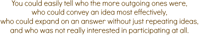 With that being said, there was no way of singling yourself out from the crowd. After the first couple of questions, I noticed that the group’s answers were as generic as the questions or were just a reiteration of the original responder. So from that point on